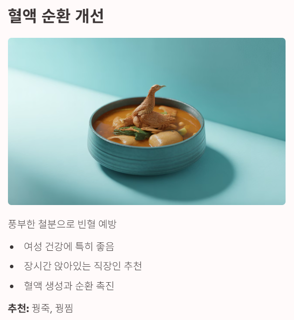 꿩고기에는 혈액 생성에 필요한 철분이 풍부하며, 이는 빈혈 예방과 혈액 순환 개선에 도움을 줍니다. 특히 여성이나 장시간 앉아서 근무하는 직장인들에게 추천되는 보양식입니다.