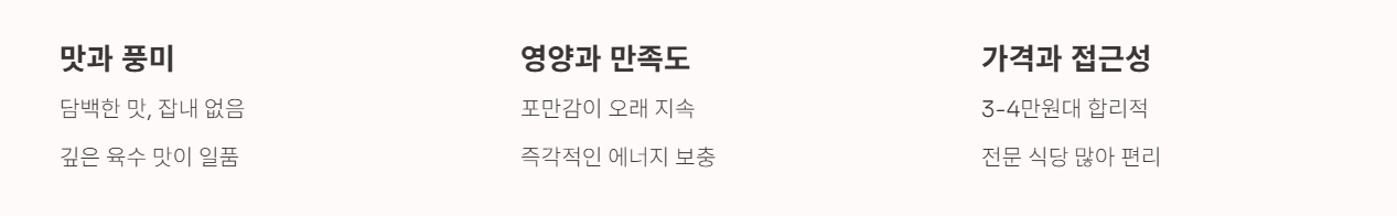 한 끼 식사 후에도 포만감이 오래가며, 피로 회복과 기운 회복 효과가 체감됩니다. 몸이 약할 때 먹으면 즉각적으로 에너지가 보충되는 느낌이 듭니다. - 가격과 접근성