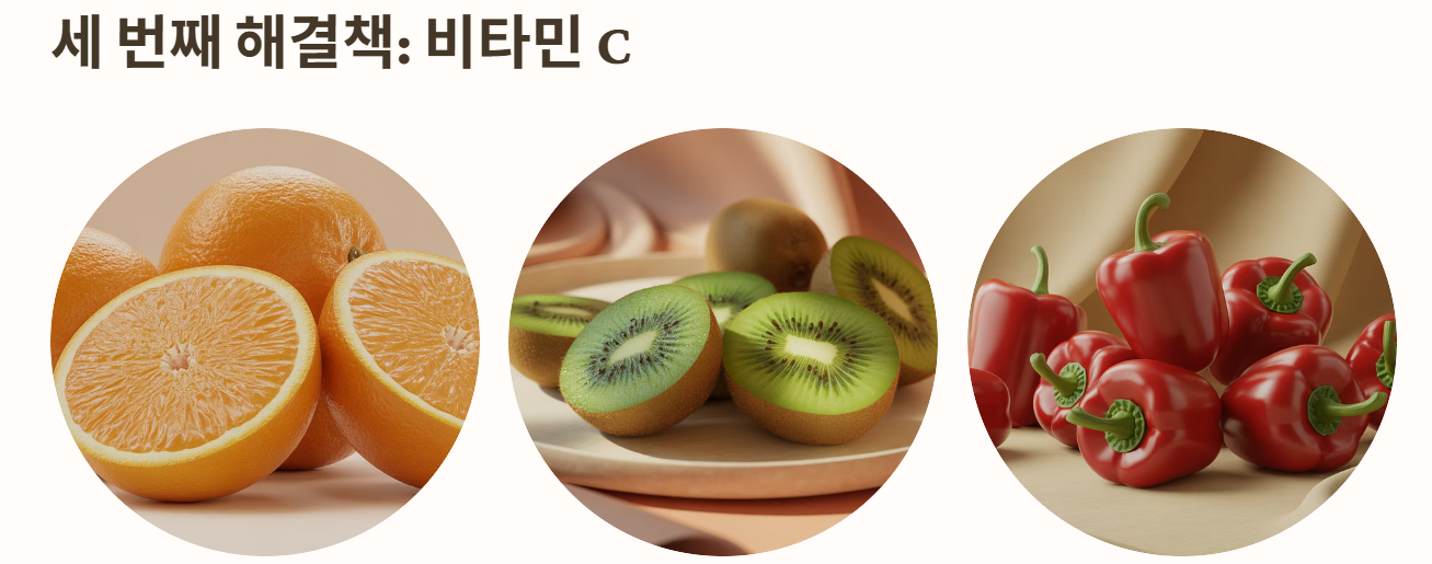 - 식품: 오렌지, 키위, 파프리카, 브로콜리, 딸기