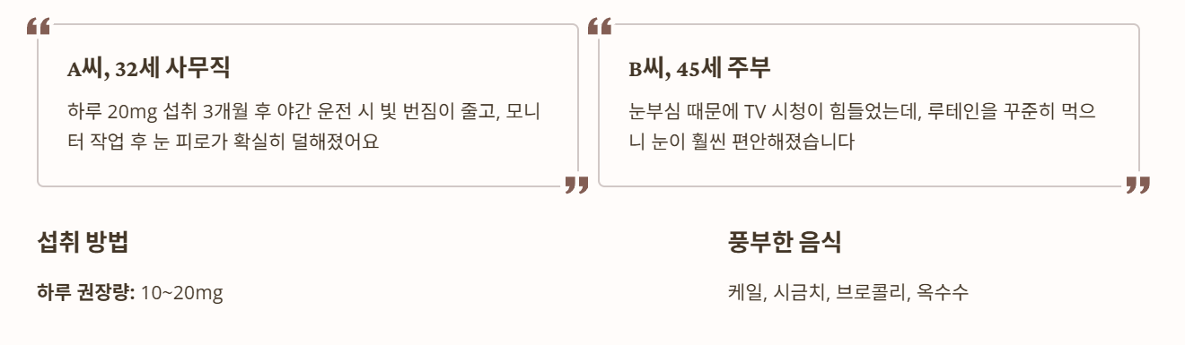 - B씨(45세, 주부): “눈부심 때문에 TV 시청이 힘들었는데, 루테인 보충제를 꾸준히 먹으니 확실히 눈이 편안해졌습니다.”