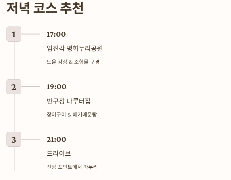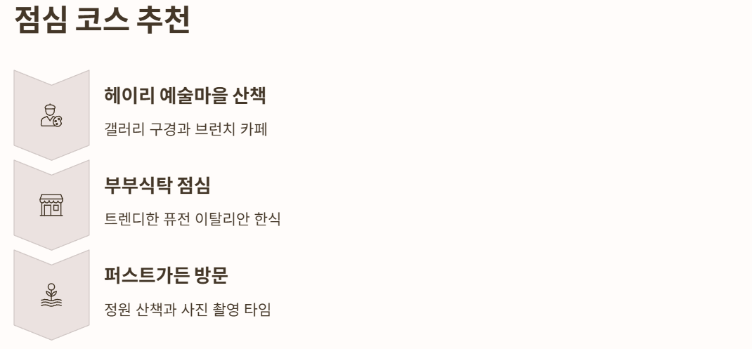 - 식사 후 공원 주변 드라이브 또는 전망 포인트에서 마무리