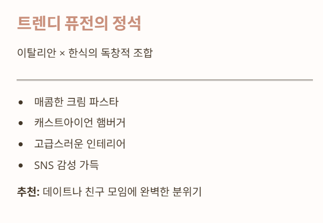 - 이탈리안 + 한식을 퓨전한 독창적인 메뉴 제공.
