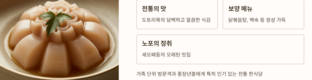 - 전통 한국식 식당으로, 도토리묵 (도토리로 만든 묵 음식)이 유명함.