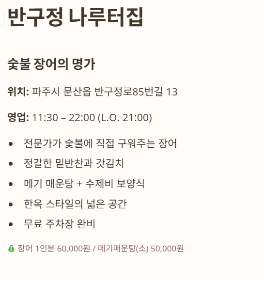 - 추천 포인트: 파주에서 장어 맛집 하면 빠지지 않는 명소. 보양식으로 좋고, 가족 모임이나 기념일 외식 장소로도 적합함. 전통 느낌이 있지만 내부는 현대적으로 리모델링되어 깔끔함.