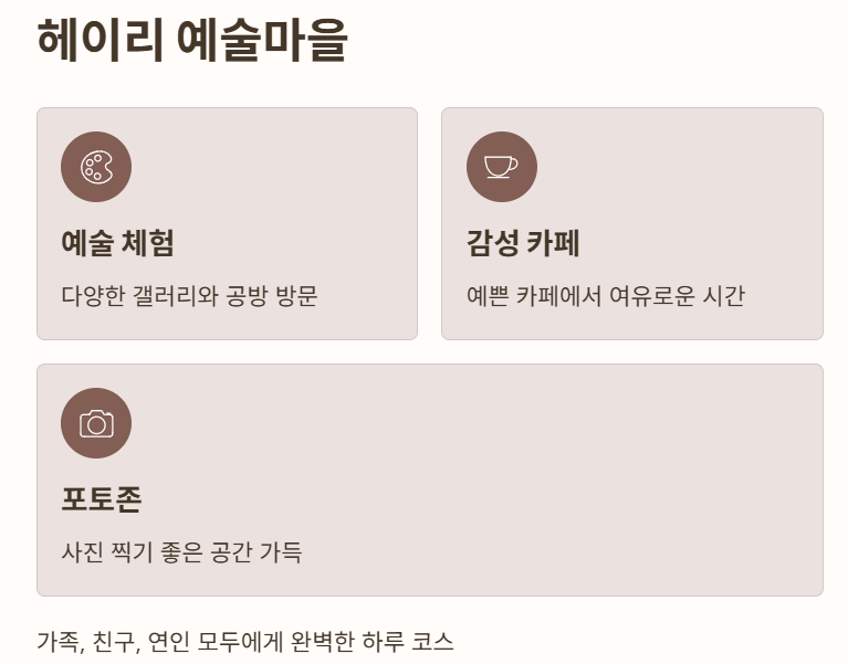 - 특징: 파주의 대표적인 예술 마을로, 갤러리, 공방, 카페, 예술 공간이 모여 있음.