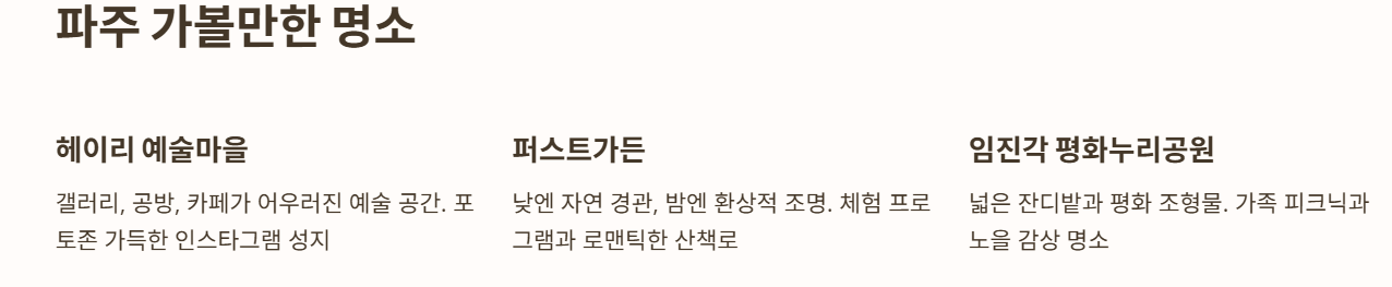 파주에서 식사 후, 또는 식사 전에 들러볼 만한 관광지 3곳도 함께 추천드릴게요.