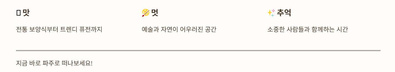 - 추천 포인트: 전통 한식만 지겹다면, 파주에서 퓨전 레스토랑을 경험하기에 아주 적합. 여행 중 색다른 분위기의 식사를 원할 때 좋음.