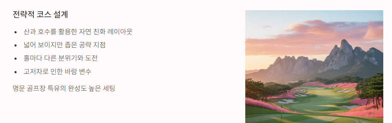 - 페어웨이가 넓어 보이지만 실제 공략 지점은 좁아 전략적인 플레이가 필요