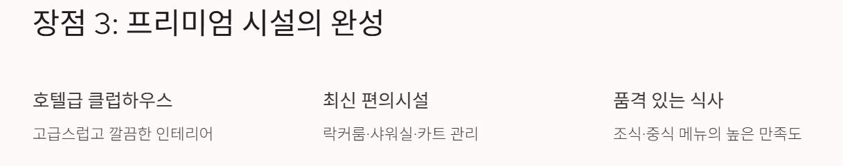 - 락커룸·샤워실·카트 등이 모두 현대적이고 관리가 잘 되어 있음