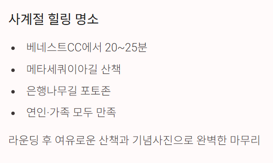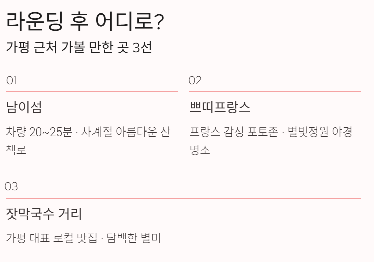 가평은 자연·맛집·레저를 한 번에 즐길 수 있는 지역이라 라운딩 후 들를 만한 곳이 풍부합니다.