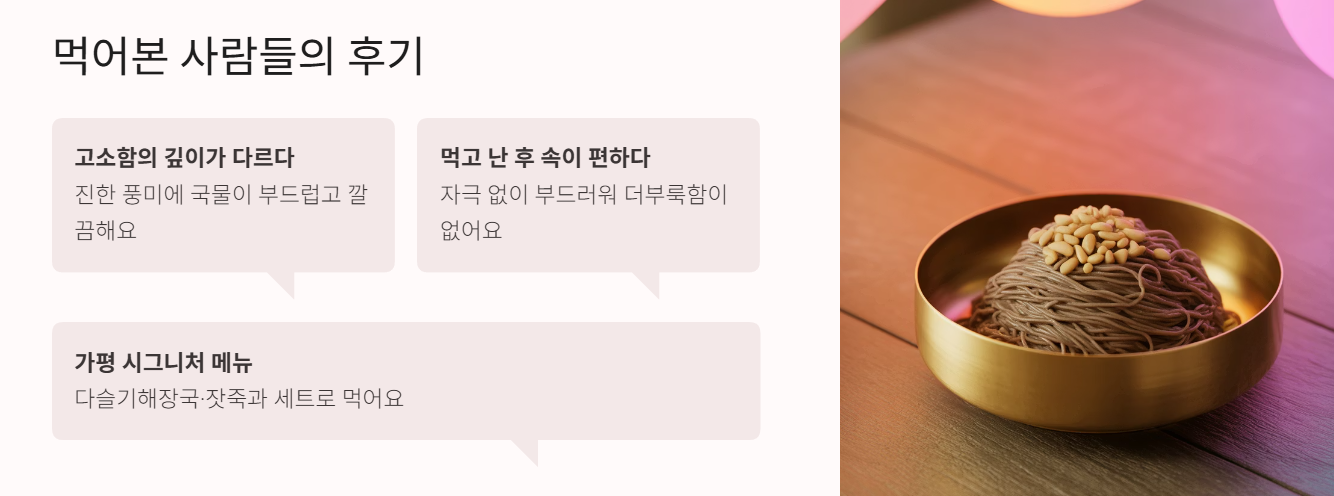 가평 여행 중 특히 여름철 많은 이들이 찾는 메뉴가 바로 잣 막국수입니다. 실제로 먹어본 사람들의 공통적인 후기는 아래와 같습니다.