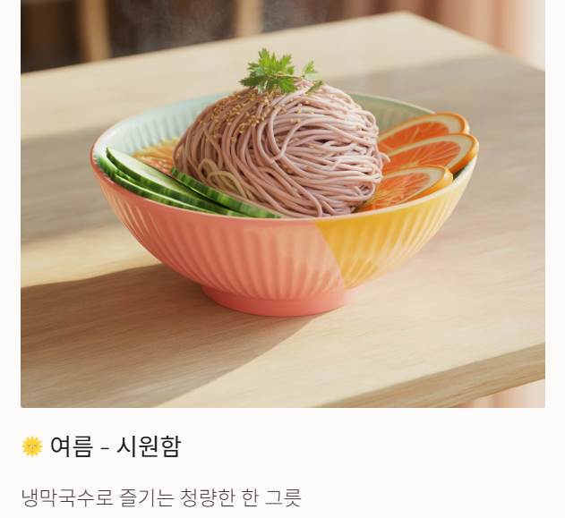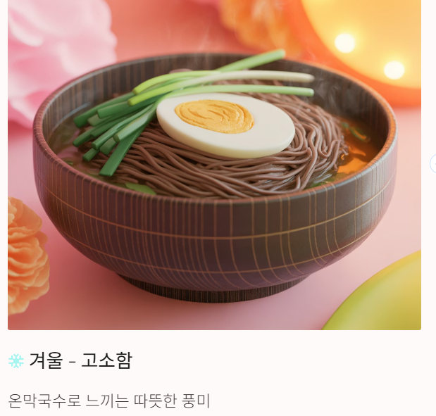 냉막국수는 여름에 이상적이고, 온막국수나 잣 막국수는 겨울에도 잘 어울린다는 점이 특징입니다.