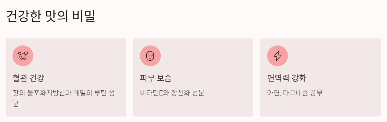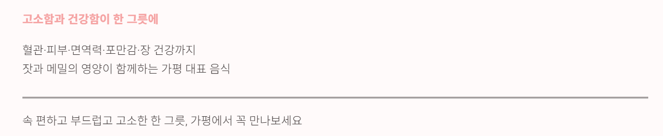 잣의 영양과 메밀의 효능이 함께해 혈관 건강·피부 보습·면역력 강화·포만감 유지·장 건강 개선 등 다양한 도움을 기대할 수 있으며, 실제 후기에서도 “속이 편하고 부드럽고 고소하다”는 의견이 많습니다.