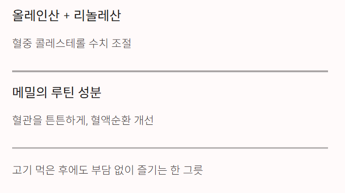 잣에는 불포화지방산, 특히 올레인산과 리놀레산이 풍부해 혈중 콜레스테롤 수치를 조절하는 데 도움을 줍니다. 여기에 메밀의 루틴 성분까지 더해져 혈관을 튼튼하게 만들고 혈액순환 개선에 긍정적인 영향을 줍니다.