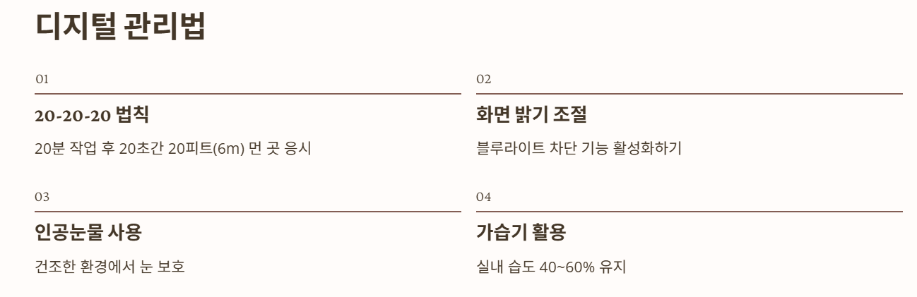 해결법: 인공눈물 사용, 가습기 활용, 장시간 모니터 작업 시 휴식.