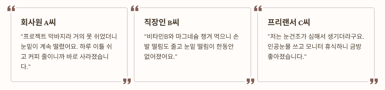 “회사 프로젝트 막바지라 거의 못 쉬었더니 눈밑이 계속 떨렸어요. 하루 이틀 쉬고 커피 줄이니까 바로 사라졌습니다.”
