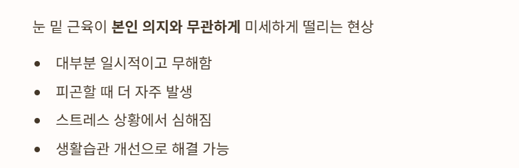 눈 밑 근육은 매우 얇고 민감하기 때문에 수면 부족·장시간 컴퓨터 사용만으로도 쉽게 피로해집니다. 이때 신경 자극이 증가해 떨림 증상이 발생합니다.
