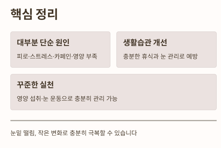 눈밑 떨림은 대부분 피로·스트레스·카페인·영양 부족 등 단순 원인으로 발생하며, 생활 습관만 바꿔도 쉽게 해결됩니다. 그러나 증상이 2주 이상 지속되거나 얼굴 전체가 떨리는 경우는 전문 진료가 필요합니다. 평소에 휴식·영양 관리·눈 운동을 꾸준히 실천하면 눈밑 떨림은 충분히 예방할 수 있습니다.