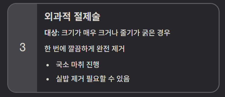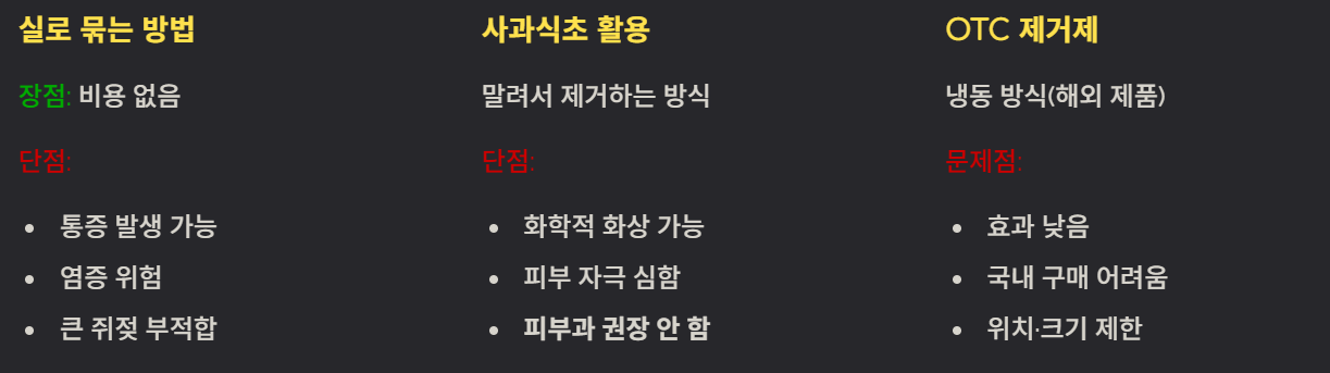 - 단점: 통증, 염증 가능성, 큰 쥐젖은 부적합