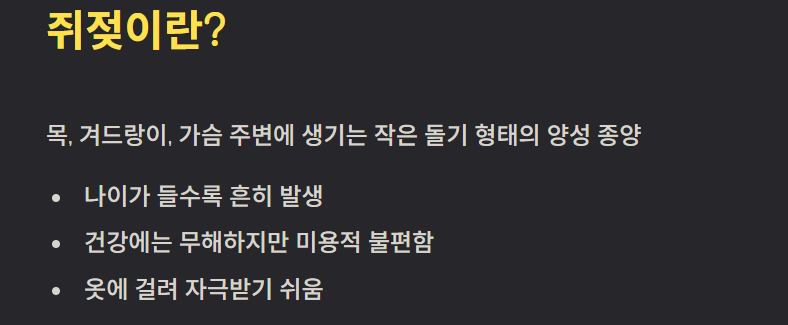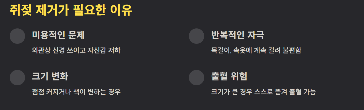 특히 크기가 큰 쥐젖은 스스로 뜯기거나 출혈이 생길 수 있어 전문가 제거가 권장됩니다.
