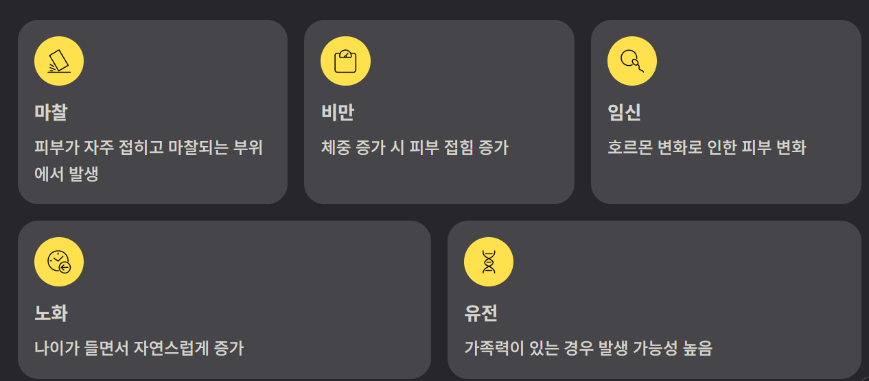 특히 비만, 임신, 노화, 유전적 요인이 큰 영향을 미칩니다. 인체에 해로운 병변은 아니지만 외관상 신경 쓰이기 때문에 제거를 고려하는 경우가 많습니다.