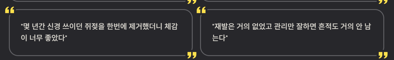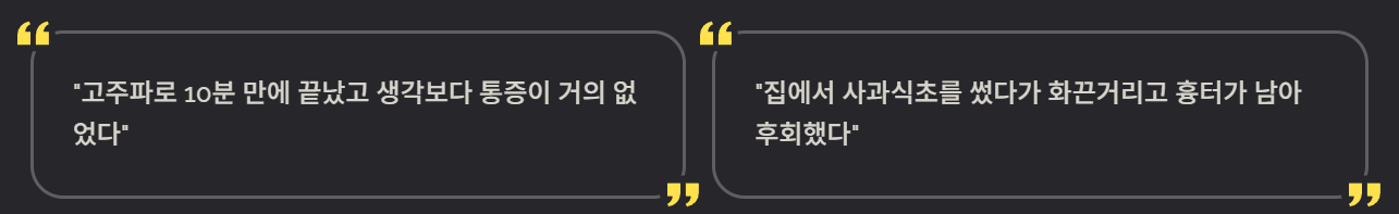 - “고주파로 10분 만에 끝났고 생각보다 통증이 거의 없었다.”