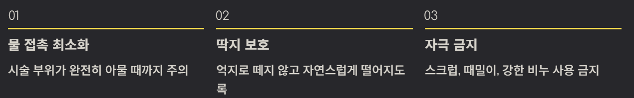 제거 후 회복 기간은 보통 3~7일입니다. 안전한 회복을 위해 아래 수칙을 지켜야 합니다.