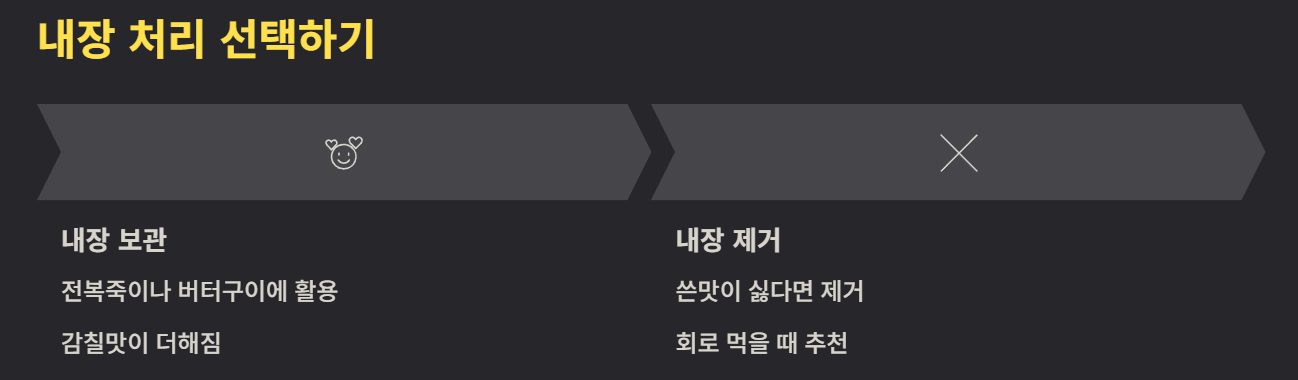 – 내장은 전복죽이나 버터구이에 사용하기도 하므로 그대로 둬도 되지만, 쓴맛이 싫다면 제거해도 됩니다.