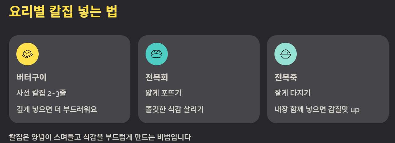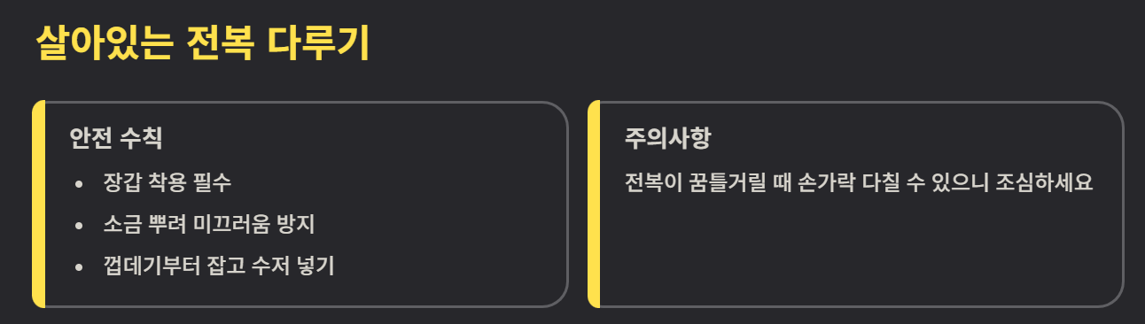 전복은 겉모습 때문에 손질이 어렵게 느껴지지만, 몇 가지 핵심 요령만 익히면 누구나 안전하고 깔끔하게 손질할 수 있는 식재료입니다. 껍데기 닦기 → 살 분리 → 내장 손질 → 헹구기 → 칼집 과정만 정확히 알면 다양한 전복 요리를 집에서도 맛있게 즐길 수 있습니다.