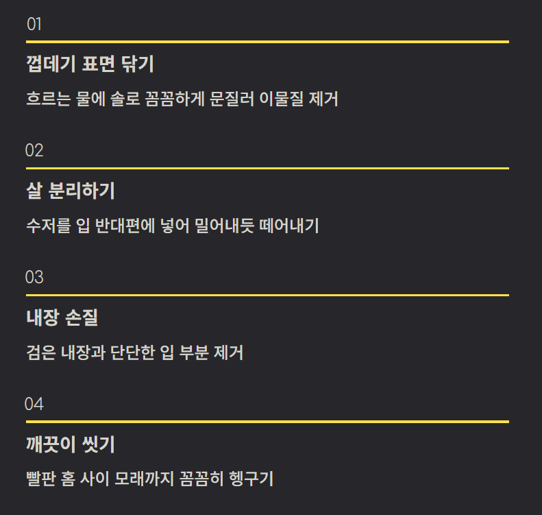 – 너무 오래 물에 담가두면 신선도가 떨어지므로 씻는 과정은 빠르게 하는 것이 좋습니다.