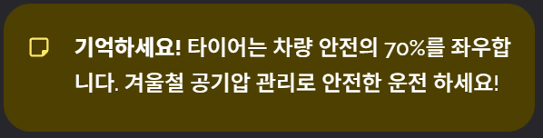 타이어는 차량 안전의 70%를 좌우하므로 특히 겨울철에는 관리가 더욱 중요합니다.
