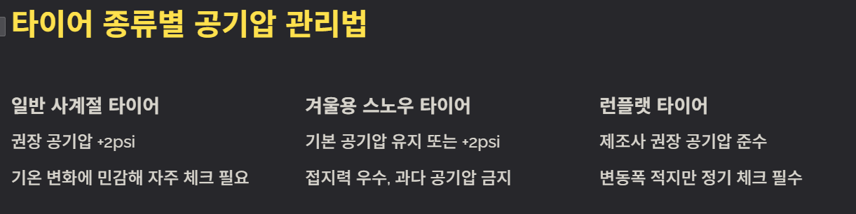 4️⃣ 타이어 종류별 겨울철 공기압 관리