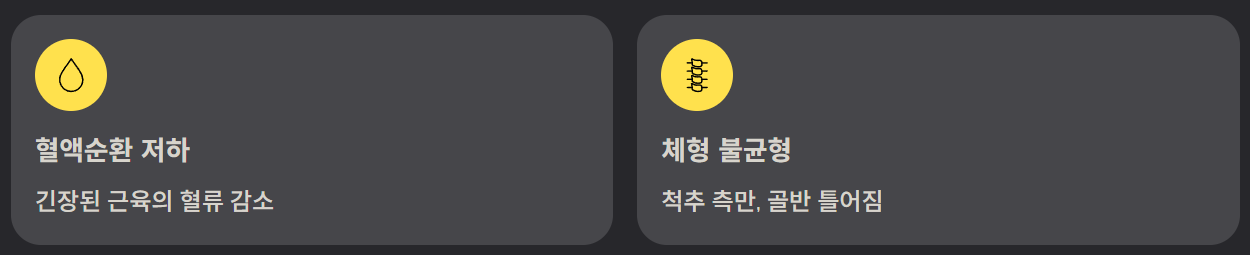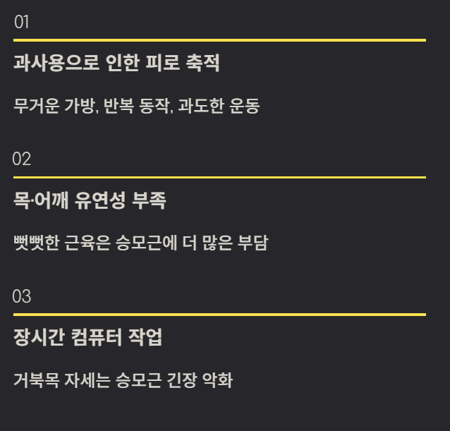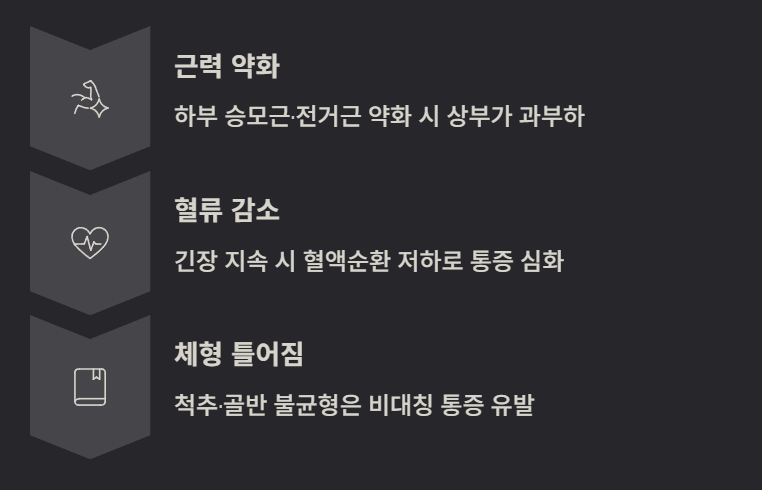척추 측만증, 골반 틀어짐, 거북목, 일자목 등 체형 불균형이 있는 경우 승모근이 특정 방향으로 과부하를 받게 됩니다. 이로 인해 한쪽만 뭉치거나 비대칭 통증이 나타나기도 합니다.