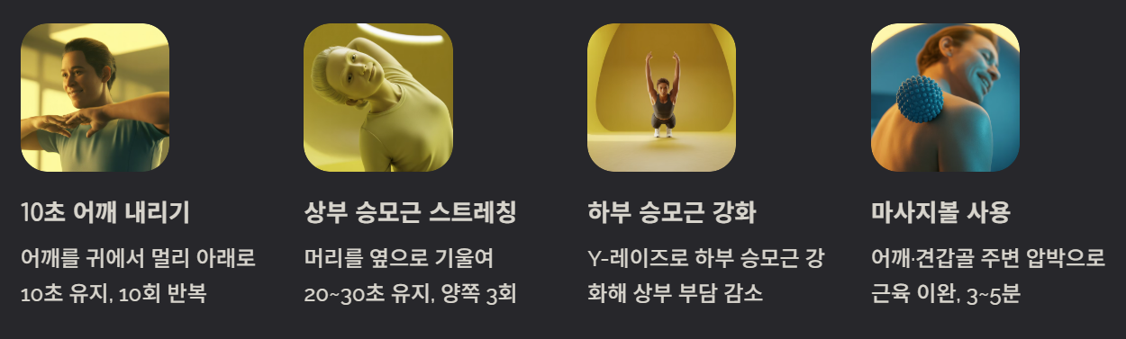 - 하부 승모근을 강화해 상부 승모근 부담을 줄임.