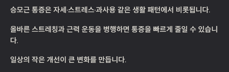승모근 통증은 단순한 근육 뭉침처럼 보여도 대부분은 자세·스트레스·과사용 같은 생활 패턴에서 비롯됩니다. 원인을 정확히 파악하고 올바른 스트레칭과 근력 운동을 병행하면 통증을 빠르게 줄일 수 있습니다. 일상의 작은 개선이 큰 변화로 이어질 수 있다는 점을 기억하시기 바랍니다.
