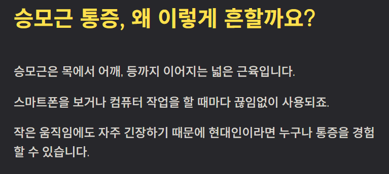 승모근은 목과 어깨를 잇는 큰 근육으로, 작은 움직임에도 자주 사용되기 때문에 통증이 쉽게 발생하는 부위입니다.