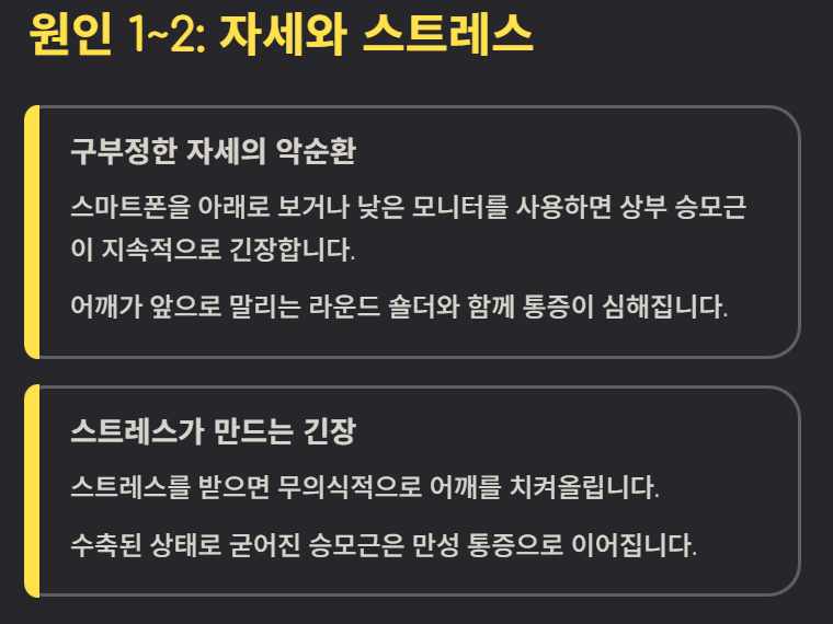 장시간 구부정한 자세는 승모근 통증의 가장 흔한 원인입니다. 특히 컴퓨터 모니터가 낮거나 스마트폰을 아래로 내려다보는 습관은 승모근 위쪽 부분을 지속적으로 긴장시켜 통증을 유발합니다. 어깨가 앞으로 말리는 라운드 숄더와 함께 나타나기도 합니다.