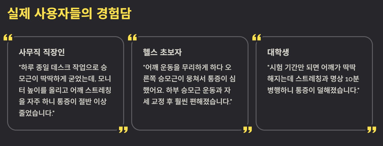 “하루 종일 데스크 작업을 하다 보니 승모근이 딱딱하게 굳었는데, 모니터 높이를 올리고 어깨 스트레칭을 자주 하니 통증이 절반 이상 줄었습니다.”