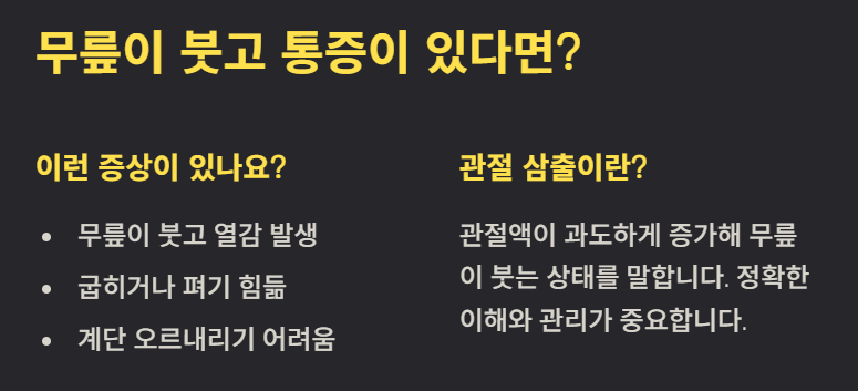일상생활에서 ‘무릎에 물이 찼다’라는 표현이 바로 이 상태를 의미합니다.