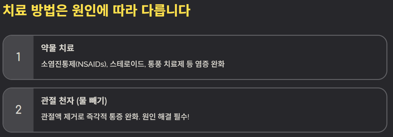 많이 부어 통증이 심할 때 관절액을 빼 통증을 완화합니다.