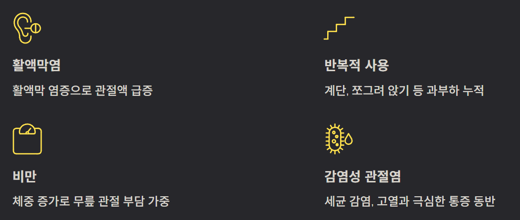 중장년층에서 가장 흔한 원인으로, 연골이 마모되면서 염증이 생기고 물이 차기 쉽습니다.