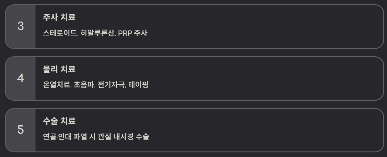 연골 파열, 인대 파열 등 구조적 문제가 클 때 관절 내시경 수술을 진행하기도 합니다.
