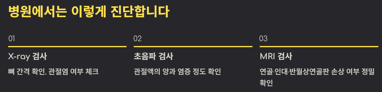 무릎 물찬 증상이 의심되면 병원에서는 다음과 같은 검사를 진행합니다.