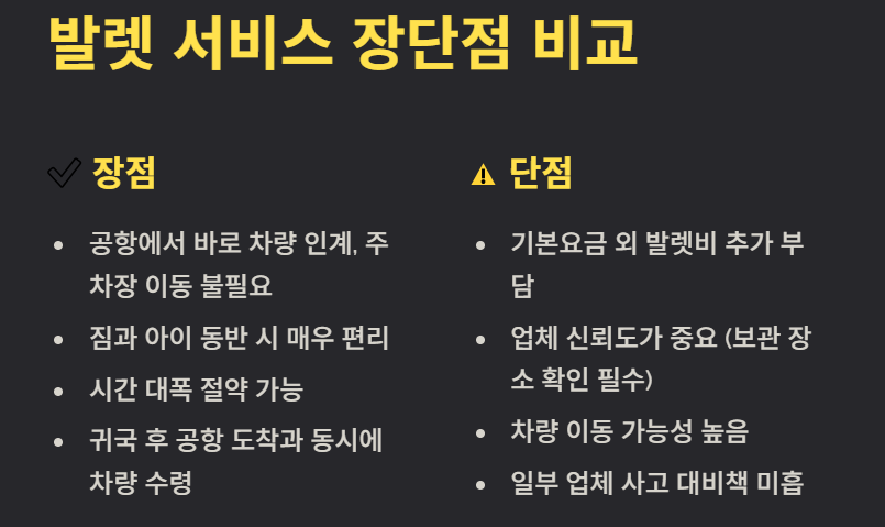 후기 2) “발렛 서비스를 이용했는데 공항에서 바로 맡기고 받아서 편했습니다. 다만 발렛 비용이 추가로 들어간 점은 고려해야 합니다.”