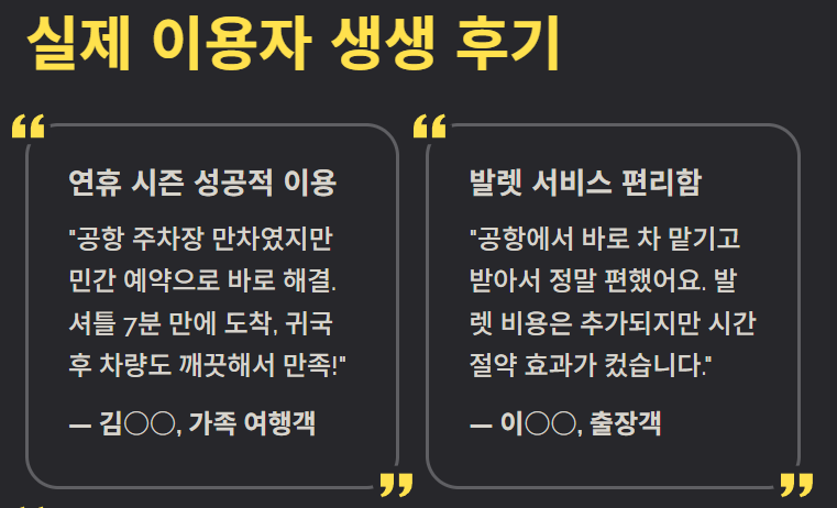 후기 1) “연휴라 공항 주차장은 만차였는데 민간 장기주차 예약으로 바로 해결했습니다. 셔틀이 7분 만에 도착했고, 귀국 후 차량 상태도 깨끗해서 만족했습니다.”