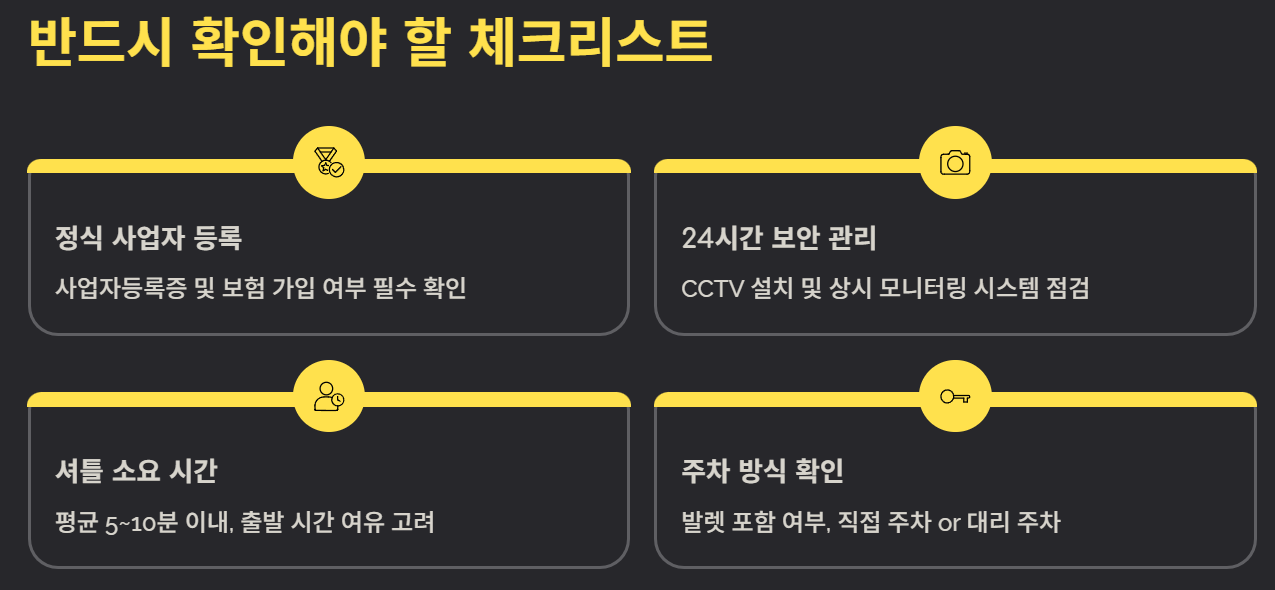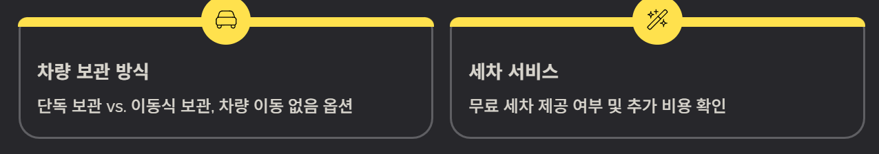 특히 차량을 다른 공간으로 이동시키는 곳도 있어 ‘차량 이동 없음’ 옵션 여부를 꼭 확인하는 것이 좋습니다.