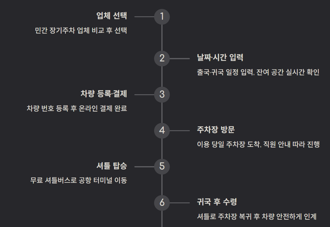 공항 근처(5~10분 거리)에 자리한 민간 장기주차장은 사전예약이 가능하고, 무료 셔틀 운영, 세차 서비스, 저렴한 장기요금 등이 강점입니다. 대부분 24시간 운영하며, 출국 시간에 맞춰 바로 공항으로 이동할 수 있어 편리합니다.