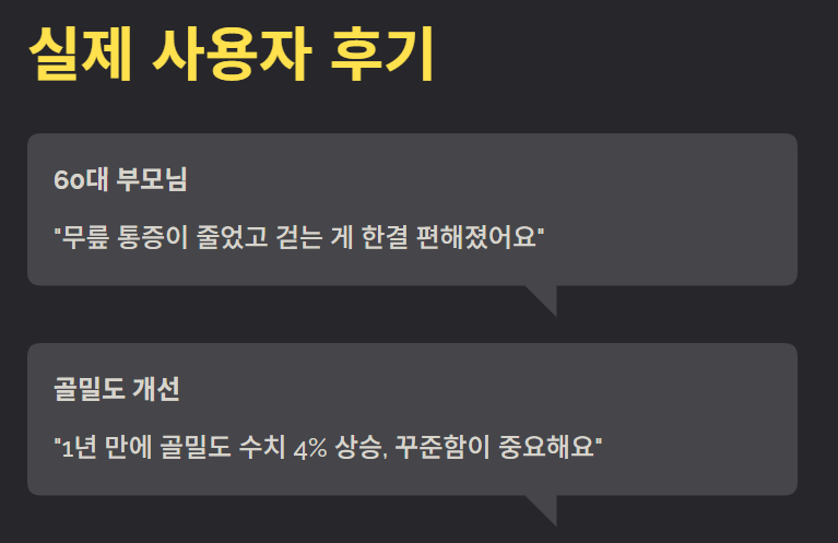 "1년 전보다 골밀도 수치가 4% 올라갔다고 병원에서 확인했습니다. 꾸준히 먹는 것이 중요한 것 같아요."