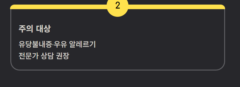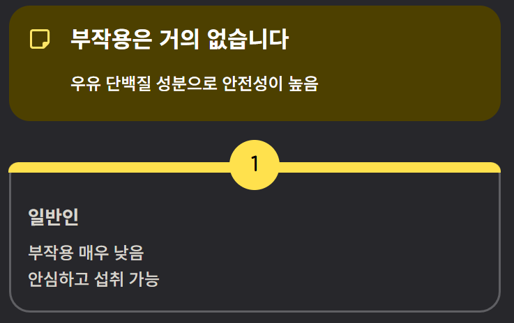 - 우유 단백질 성분이므로 유당불내증·우유 알레르기 있는 경우 주의
