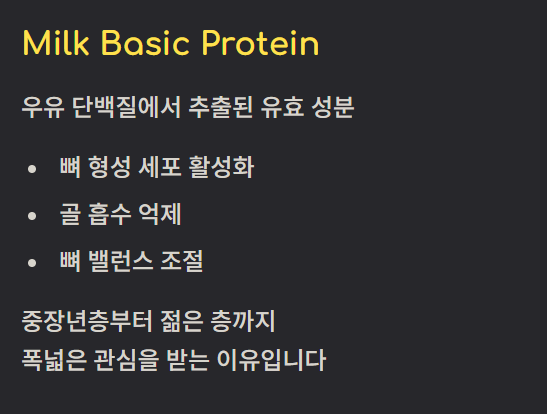 여성의 경우 폐경 이후 골다공증 위험이 빠르게 증가하는데, MBP는 뼈의 파괴 속도를 늦추고 생성 속도를 높여 골다공증 예방 기능성으로 주목받습니다.